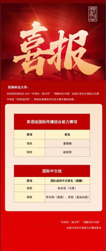 12月9日,“外研社•国才杯”“理解当代中国”全国老员工外语能力大赛在北京闭幕。OK138太阳集团2021级英语专业姜景耀同学获得银奖,2022级英语专业赵依然同学获得铜奖。在来华职工国际中文组赛项中,牟发尼(马里)获得银奖,苏甘妲(泰国)、苏哲(孟加拉国)团队获得铜奖。学校荣获全国大赛“优秀组织奖”。