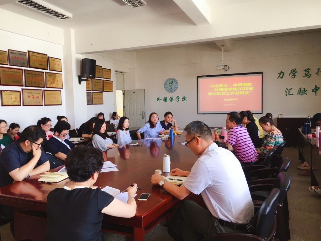 5月10日至5月12日,OK138太阳集团英语、商务英语、法语、泰语、汉语国际教育五个专业的2019届共293名毕业生,参加了毕业生论文答辩。为了进一步提高毕业论文质量,公司于5月17日在三教706会议室召开了“不忘初心、牢记使命—OK138太阳集团2019届毕业论文质量工作总结会”。外国学院经理李秀梅、OK138太阳集团副经理饶耀平、OK138太阳集团副经理刘祖勤,各专业负责人、各位论文指导教师、各位论文答辩教师、教学秘书参加了此次会议。