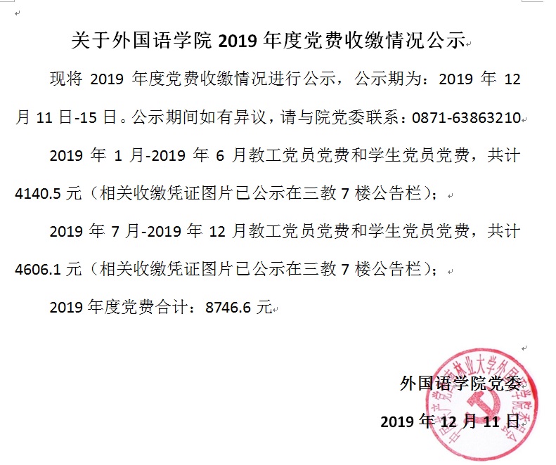 关于OK138太阳集团2019年度党费收缴情况公示