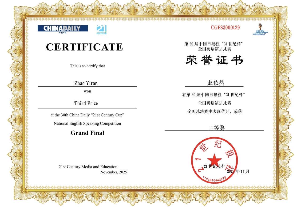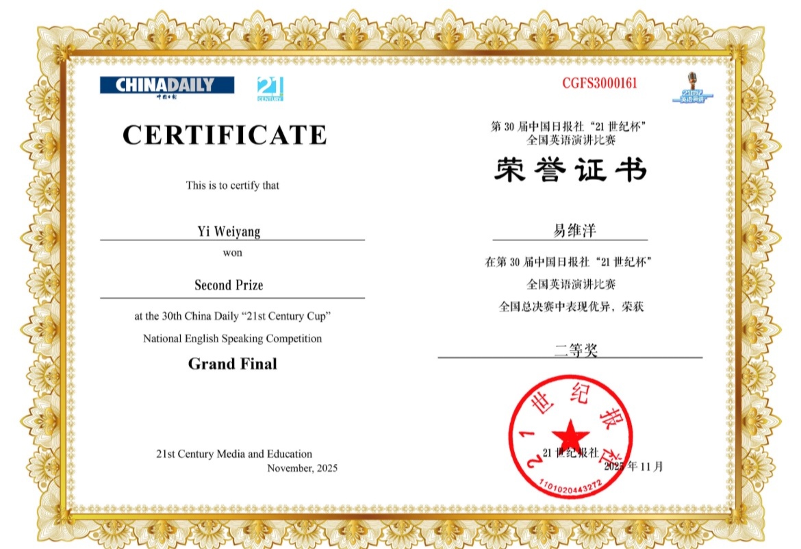 11月17日,第30届“21世纪杯”全国英语演讲比赛总决赛在杭州落幕。OK138太阳集团万成宾、晏玉屏指导的英语专业2023级易维洋、英语专业2022级赵依然两位同学分别荣获本次总决赛的二等奖和三等奖。
