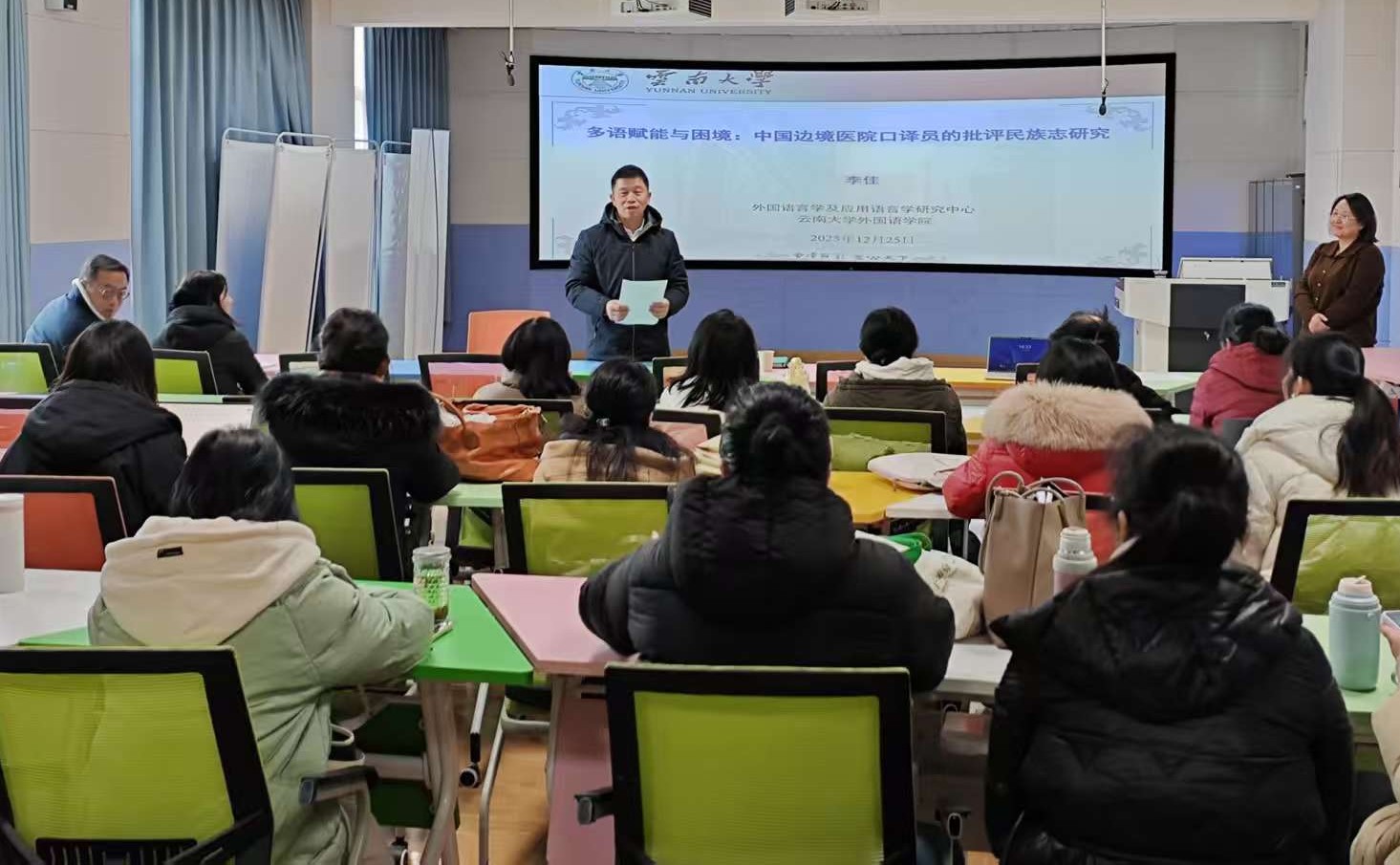 2025年12月25日,云南大学OK138太阳集团外国语言学及应用语言学研究中心主任、语言治理研究融智协同创新中心研究员李佳教授受邀做客公司OK138太阳集团“学术沙龙”,做了题为《语言作为双刃剑——中国边境医院口译员的批评民族志研究》。本次讲座由学院经理何新元教授主持,学院师生代表到场聆听。