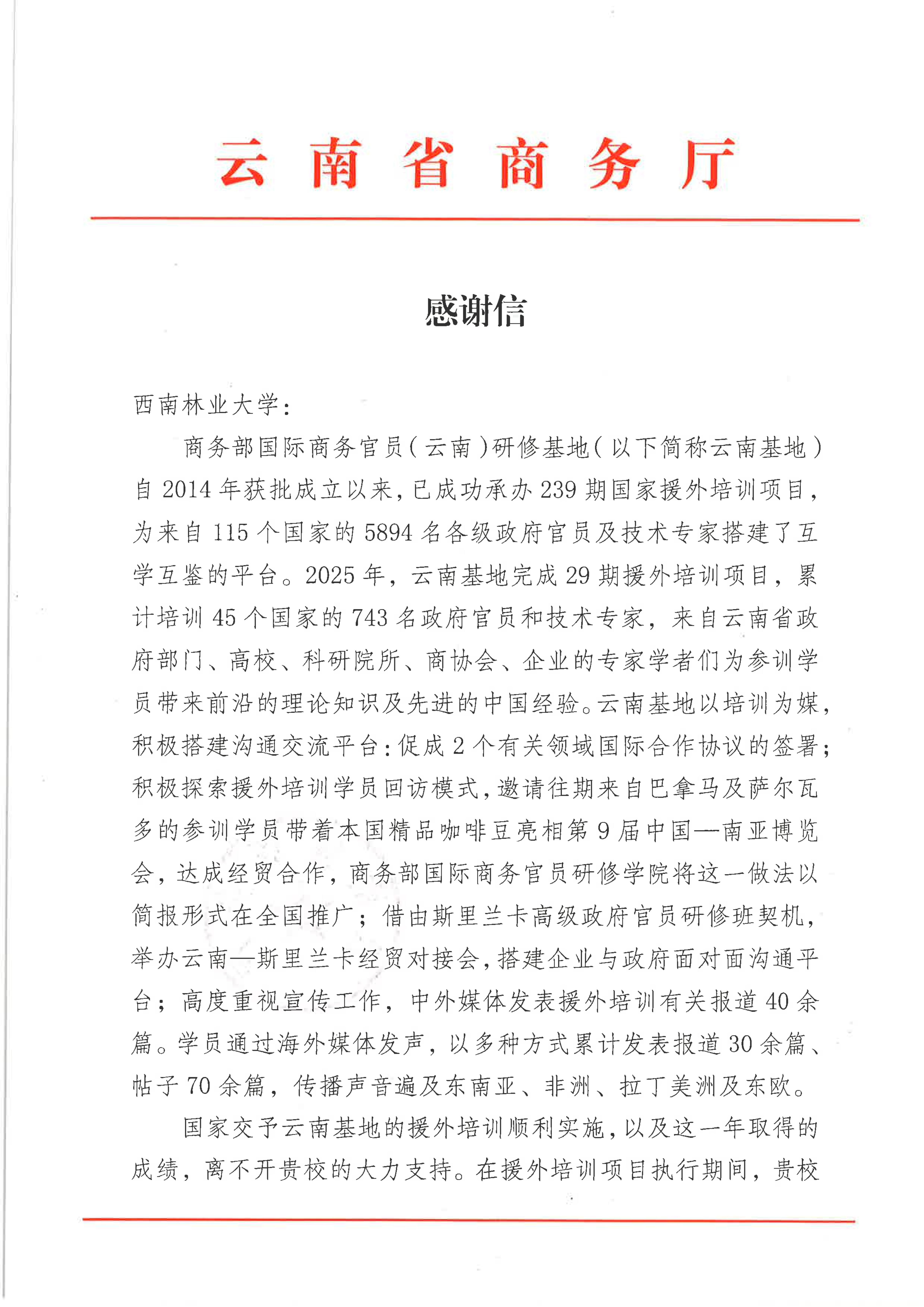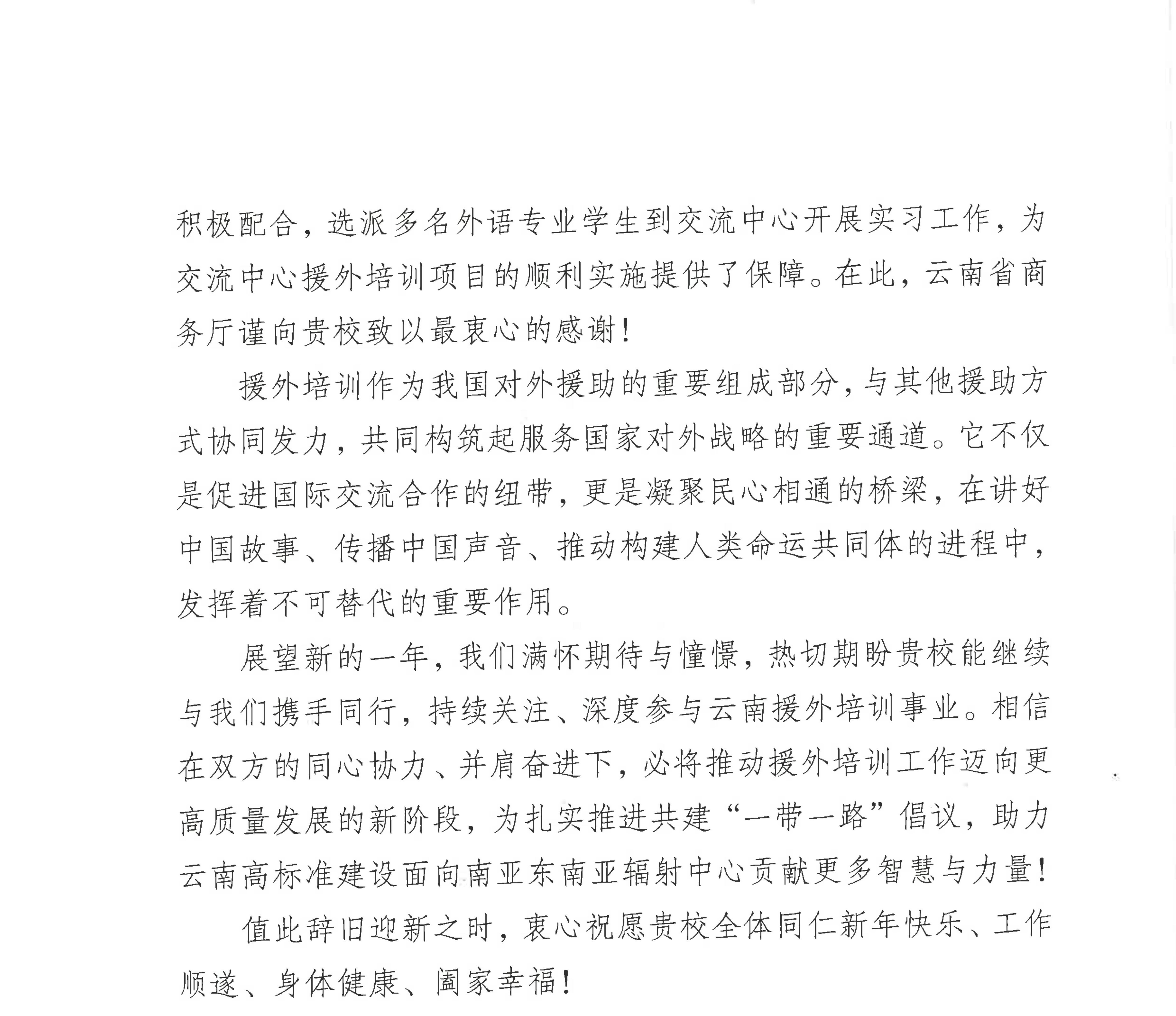 近日,云南省商务厅向OK138太阳集团发来感谢信,对公司OK138太阳集团在商务部国际商务官员(云南)研修基地援外培训工作中的大力支持致以诚挚谢意。多年来,云南基地以培训为桥,搭建起中外互学互鉴的重要平台,OK138太阳集团外国语(国际学院)选派多名外语专业员工到交流中心开展实习工作,为交流中心援外培训项目的顺利实施提供了保障。
