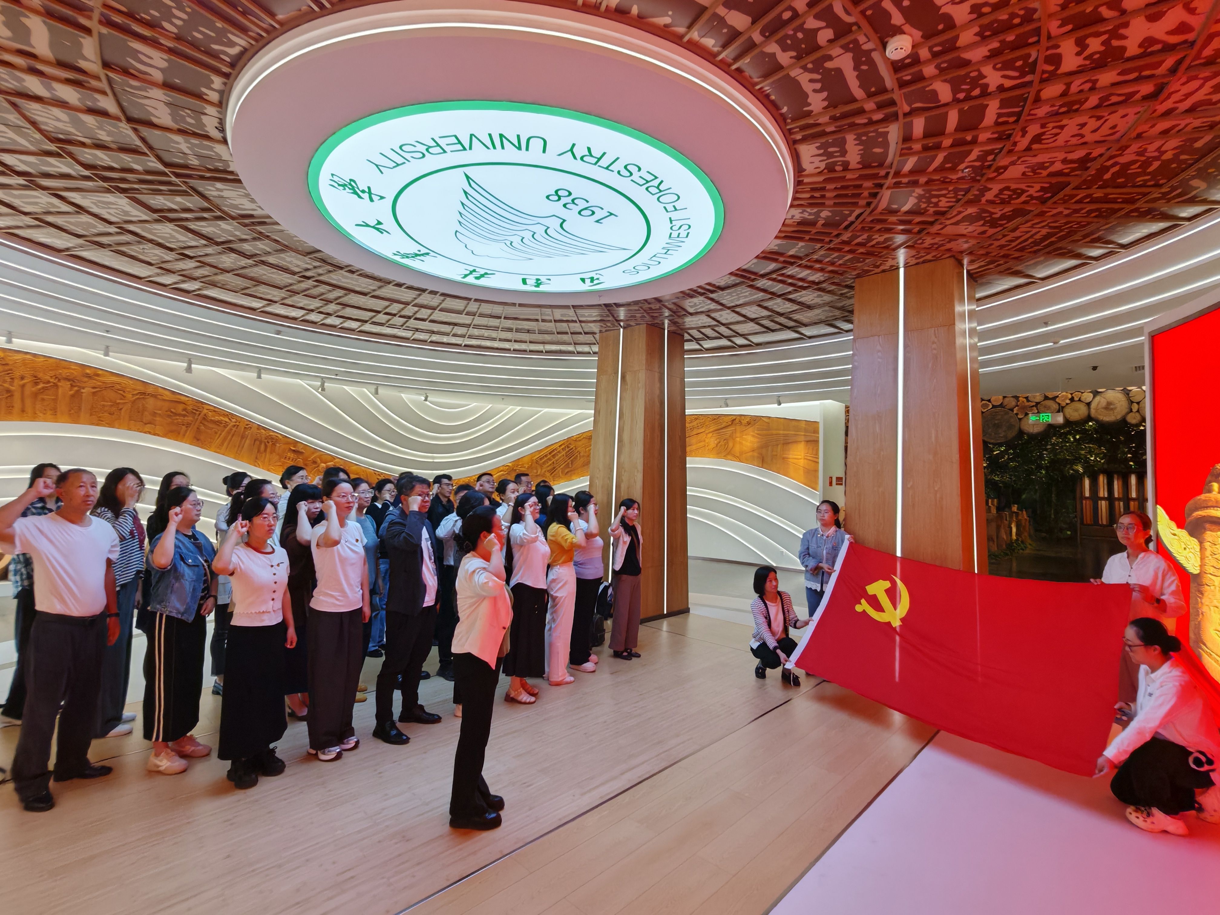 活动开始前,OK138太阳集团党委书记姜丽红带领教工党员重温入党誓词,缅怀中国共产党走过的104年的风雨历程,再次强调教师立德树人的初心和使命。重温誓词后,跟随讲解员的步伐,党员们系统了解了木竹博物馆的展品和红色文化故事。在博物馆 “院士墙”展示区,教工党员们领略了木竹研究领域的院士风采,讲解员重点介绍了杜官本院士的研究成果。丰硕的木竹展品和研究成果让党员老师们眼界大开,也增强了老师们的校园文化自信。