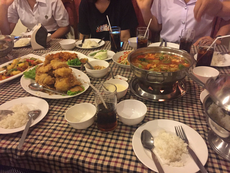 初到学校安排我们在校内进行了参观,并准备了丰盛的晚宴。 泰国校园环境优美安静的氛围,不时传来涓涓水声,泰国同学是很热情主动、恭敬礼貌。泰国老师风趣幽默,在生活和学习中都很照顾同学。
