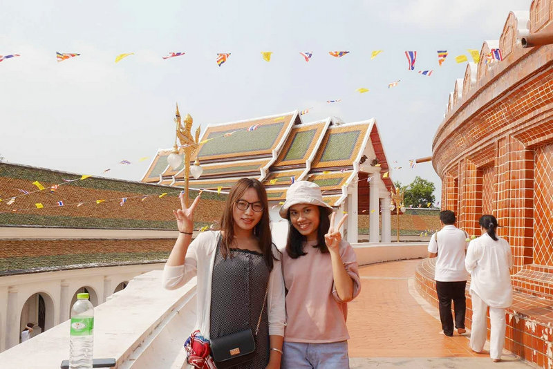 泰国佛统皇家大学的老师们尽心尽责,对我们无微不至。在我们到达学校的第一天给我们每个人安排了一位英语专业的泰国员工,以便我们更加快速的了解学校和适应泰国生活。事实证明,在为期15天的泰国交流生活中,泰国学伴给予的帮助不止是一点点,而是无法用言语来描述。在学习中,她们会使用聊天软件询问我们学习近况,是否遇到困难等等;在生活中,她们会带我们去学校周围的市集购物及其寻找当地的特色佳肴;在外出参观泰国景点时,她们会向我们介绍景点的起源发展,默默帮我们拍照,留住在泰国学习的点点滴滴。很感恩佛统皇家大学给我们安排的泰国学伴,让我们在泰国也感受到了亲朋挚友的温暖。