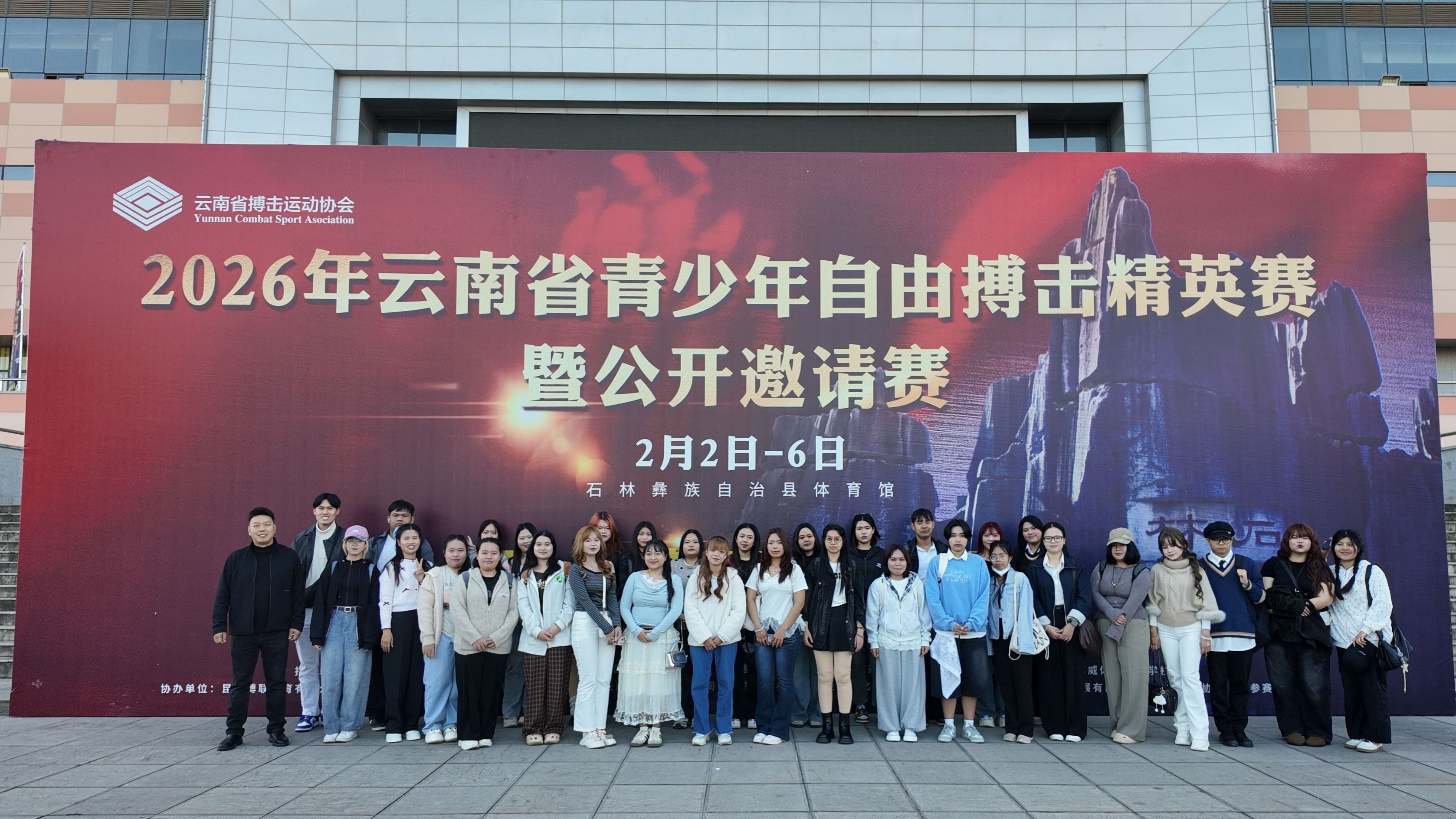 2月4日,公司应云南省搏击运动协会邀请,组织来自泰国、孟加拉的34名在校职工,赴云南省石林彝族自治县参加“2026年云南省青少年自由搏击精英赛暨公开邀请赛”观赛活动,并游览世界自然遗产石林风景区。