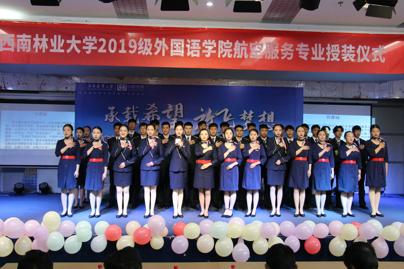 接下来,领导们为同学们授装,当同学们郑重地接过“服装”那一刻,意味着他们已经接过了成为“民航人”的重任和担当。授装后,讲授“民航礼仪”课程的姜老师为大家进行了“制服讲解”,让大家懂得了穿在身上的制服,不仅仅会让你感受到作为一个未来民航人的骄傲和自豪,同时也让你感受到身穿制服的责任和意义。在员工代表发言后,同学们进行了庄严的“集体宣誓”,立下了要培养自己的团队意识、集体观念、奉献精神和良好的职业道德,努力学习上进,把自己培养成为合格的“民航人”的铮铮誓言。