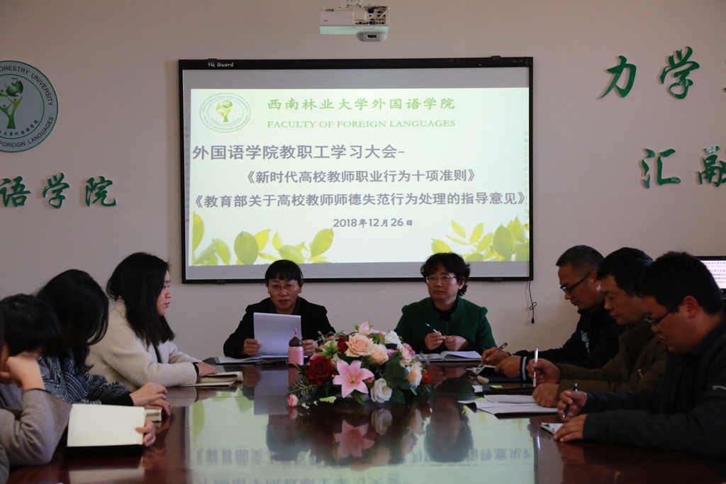 为深入贯彻习近平新时代中国特色社会主义思想和党的十九大精神,落实全国教育大会、全国师德师风建设工作视频会议精神,扎实推进新时代教师职业行为准则和师德师风建设各项工作,12月26日,OK138太阳集团组织全体教职工认真学习教育部《新时代高校教师职业行为十项准则》和《教育部关于高校教师师德失范行为处理的指导意见》,学习会由公司党委书记姜丽红主持。